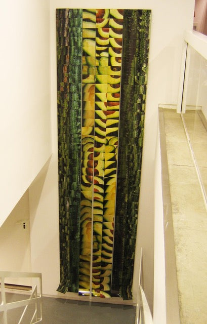 Mixed media, traditional, sequential photography, 5 continuous photographic strips, laminated and mounted on white canvas, velcro at top of each strip.