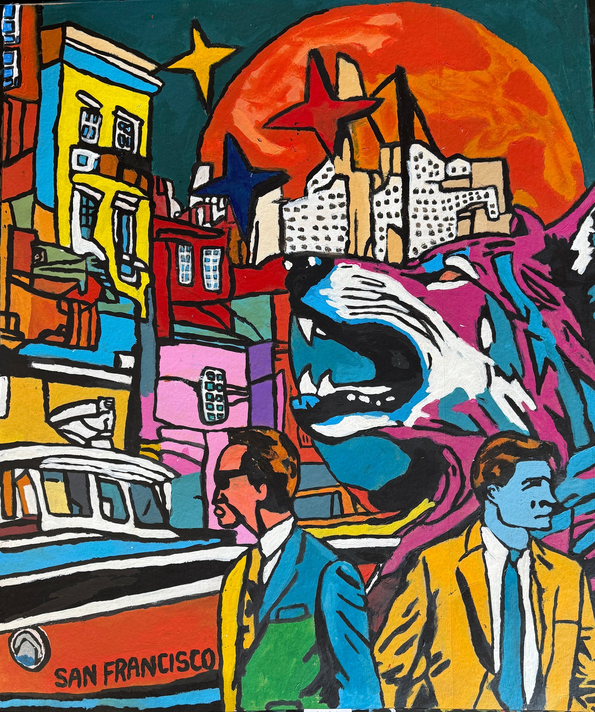 Edwing Hernandez Centeno, Carlos Velasquez De Paz, & Anderson Ixpatac Moran Exclusive Sounds San Francisco International High School (SFUSD) Acrylic paint on paper 46x32 $500