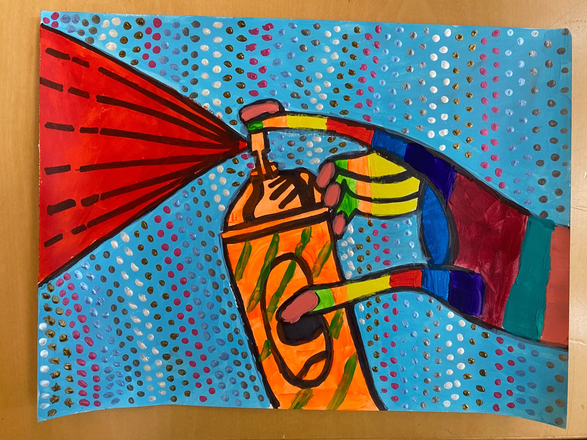 This piece was inspired by and created in the style of Roy Lichtenstein. The original piece reminded me of the people who have used hairspray for many generations. I chose to add the bright rainbow colors to represent the vibrancy of San Francisco. I have been an artist since I was 6 years old. Art is very hard work but if you open your eyes and use your imagination it can take you anywhere. My favorite art medium is to use recycled objects. I am autistic. I like doing art because its fun and entertaining.
