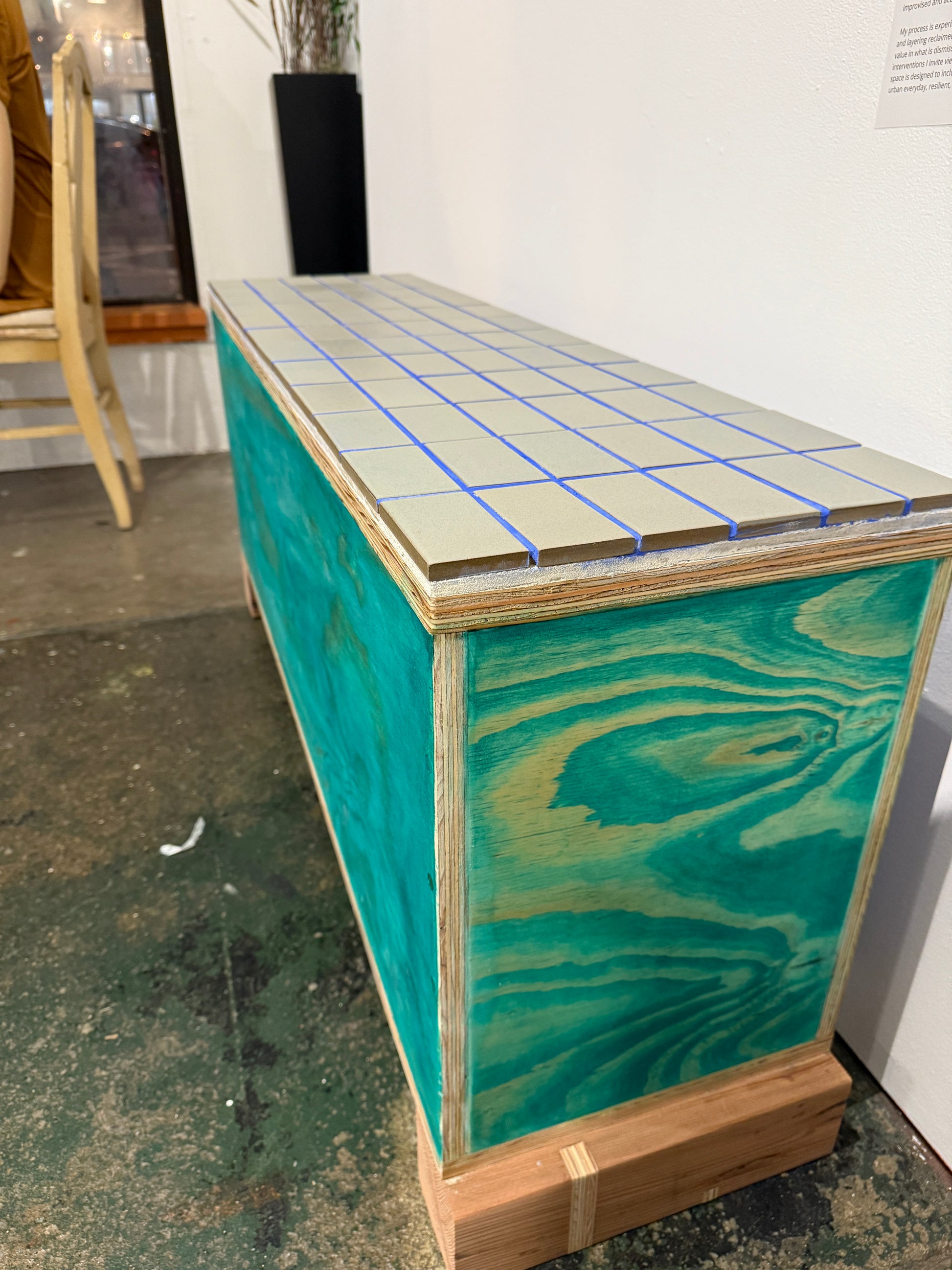 Heath ceramic tiles, plywood scraps, 4x4 lumber, EPS foam, cyano green, cobalt blue, polyurethane finish