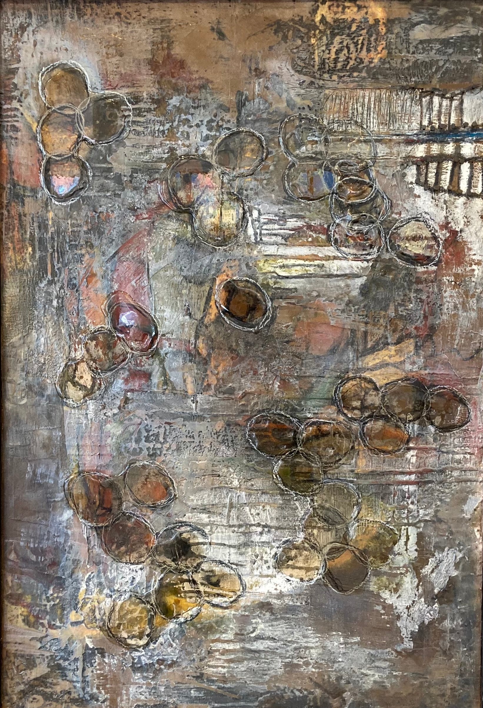Between 2000-2002, I moved from Eugene to Washington DC, then to Denver never finding my “home” until committing to living in SF in 2003. Moving here, as most people know can be a scary leap due to the high rents and compromises that afflict nearly all housing situations here. I’d been making drip drawings in the back of the van on all my traverses back and forth across the country. This mountain of ink on paper drawings became the beginning of my search for what “resists and what absorbs”. This metaphor also my own search to find my way into a place and community of people where I felt I belonged. I love beeswax, random hardware, handmade paper, thread, and color - and try to find ways to bring those all into one place. Wax was used to build a surface from the ink drips. Color was imbued in the spaces between and to celebrate the texture of the wax. Resin simply to magnify the beginning layer.