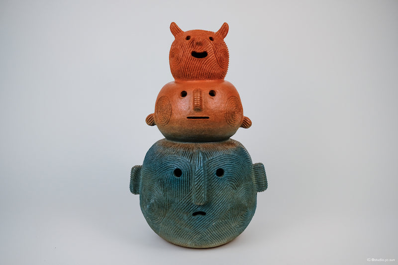 High-fired stoneware, hand-built with coiling, airbrushed underglaze finish